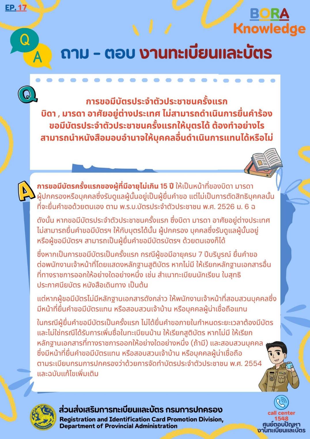 ถาม – ตอบงานทะเบียนและบัตร ตอนที่ 17callcenter154821 ตุลาคม 2567bora-knowledge, ประชาสัมพันธ์ Bora Knowledge EP.17 ถาม – ตอบ งานทะเบียนและบัตร ตอนที่ 17 หัวข้ออื่นๆที่น่าสนใจ คู่มือ[คู่มือ] แนวทางการเชื่อมโยงใช้ประโยชน์ข้อมูลจากระบบบูรณาการฐานข้อมูลประชาชนและการบริการภาครัฐก.ย. 22, 2567อ่านต่อคู่มือ[คู่มือ] ซักซ้อมแนวทางจัดพิมพ์บัญชีผู้มีสิทธิเลือกตั้งก.ย. 22, 2567อ่านต่อbora-knowledgeประชาสัมพันธ์ถาม – ตอบงานทะเบียนและบัตร ตอนที่ 9ส.ค. 19, 2567อ่านต่อ