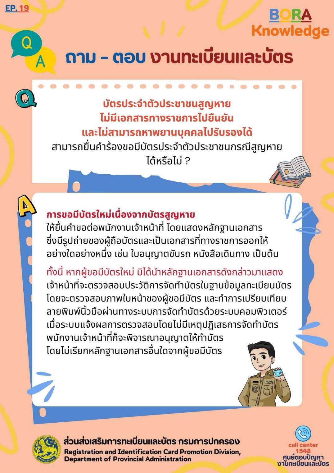 ถาม – ตอบงานทะเบียนและบัตร ตอนที่ 19callcenter15484 พฤศจิกายน 2567bora-knowledge, ประชาสัมพันธ์ Bora Knowledge EP.19 ถาม – ตอบ งานทะเบียนและบัตร ตอนที่ 19 หัวข้ออื่นๆที่น่าสนใจ bora-knowledgeประชาสัมพันธ์ถาม – ตอบงานทะเบียนและบัตร ตอนที่ 7ก.ค. 1, 2567อ่านต่อคำถามที่พบบ่อยคำถามที่พบบ่อยประจำเดือน ประจำเดือน มีนาคม 2566 (ส่วนการทะเบียนราษฎร)มี.ค. 19, 2566อ่านต่อคำถามที่พบบ่อยคำถามที่พบบ่อยประจำเดือน ประจำเดือน กันยายน 2566 (ส่วนบัตรประจำตัวประชาชน)ก.ย. 22, 2566อ่านต่อ
